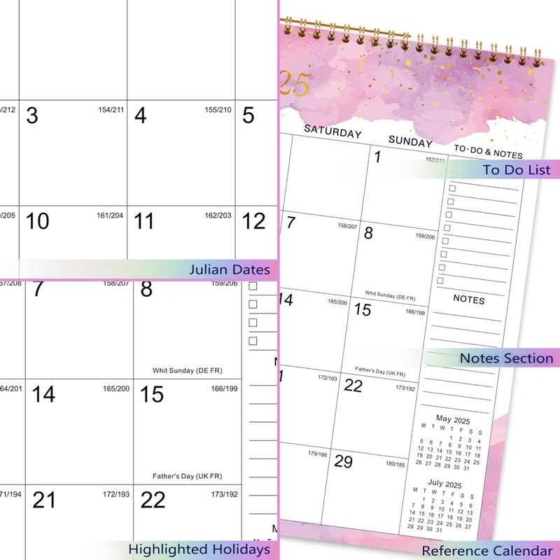 - GOOD REMINDER - Julian date, marked holidays and 2 months references in each monthly page remind you of the important dates and help to remain conscious of time.