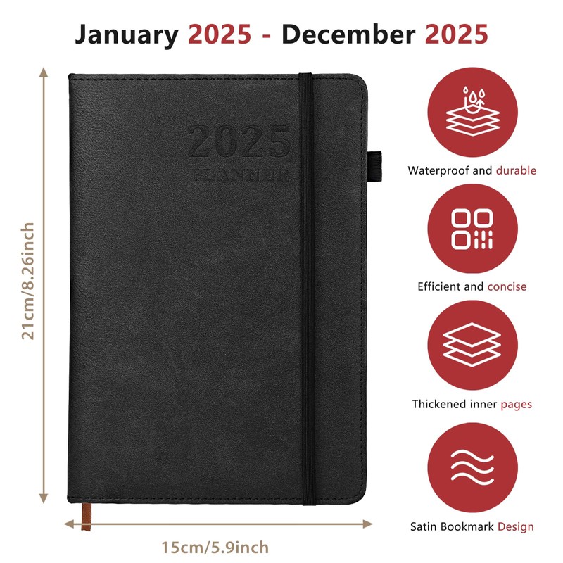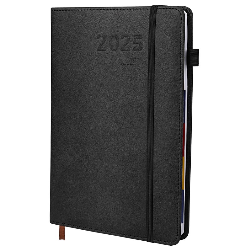 Calendar 2025 Weekly Planner A5, 21 x 14.8 cm, 12 Month Academic Planner, Soft Cover with PU Leather, Pen Loop, Monthly Tabs - Black