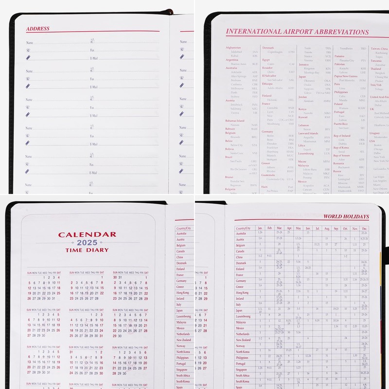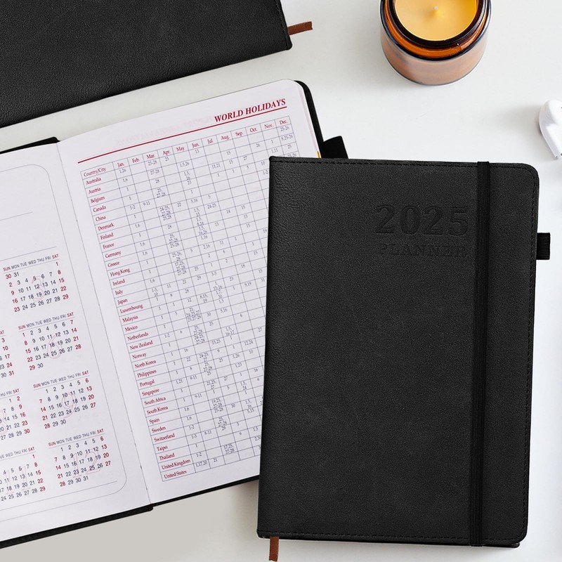 - COMPREHENSIVE PLANNING: The interior design of the planner includes a full year calendar for 2025, a 2025 year planning page, and a contact and address page.