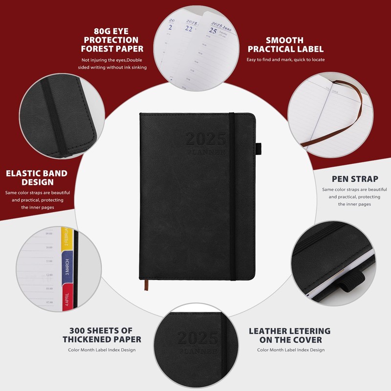 - COMFORTABLE BINDING: The black elastic band keeps the planner securely closed, and the black bookmark ribbon allows you to quickly find your place.