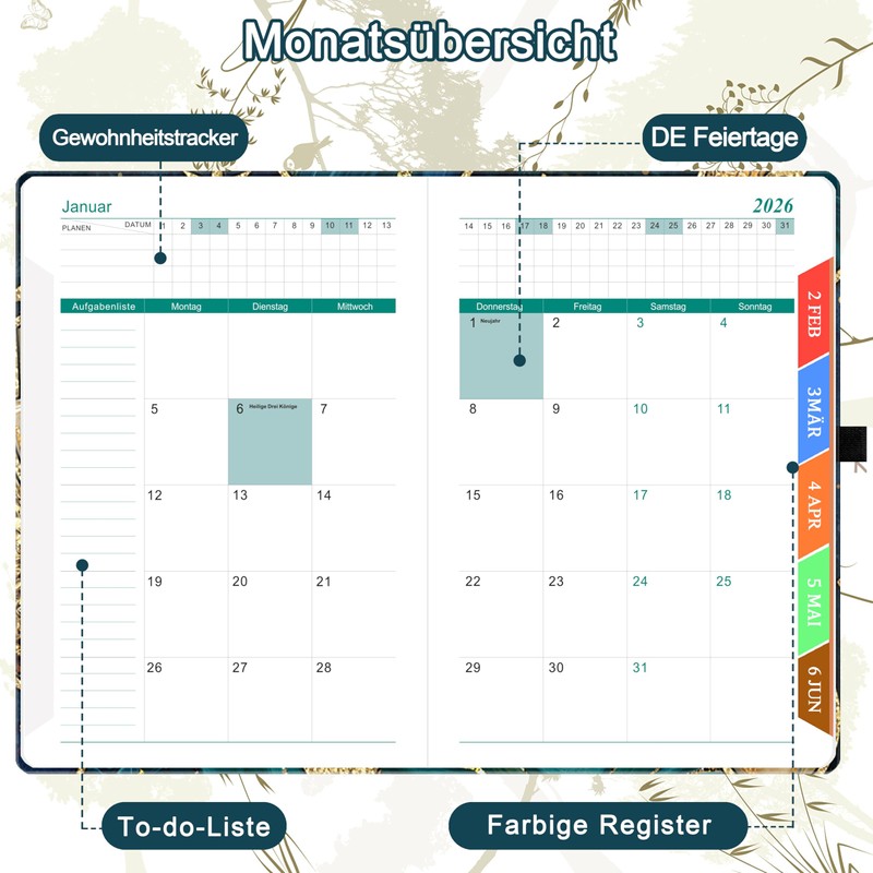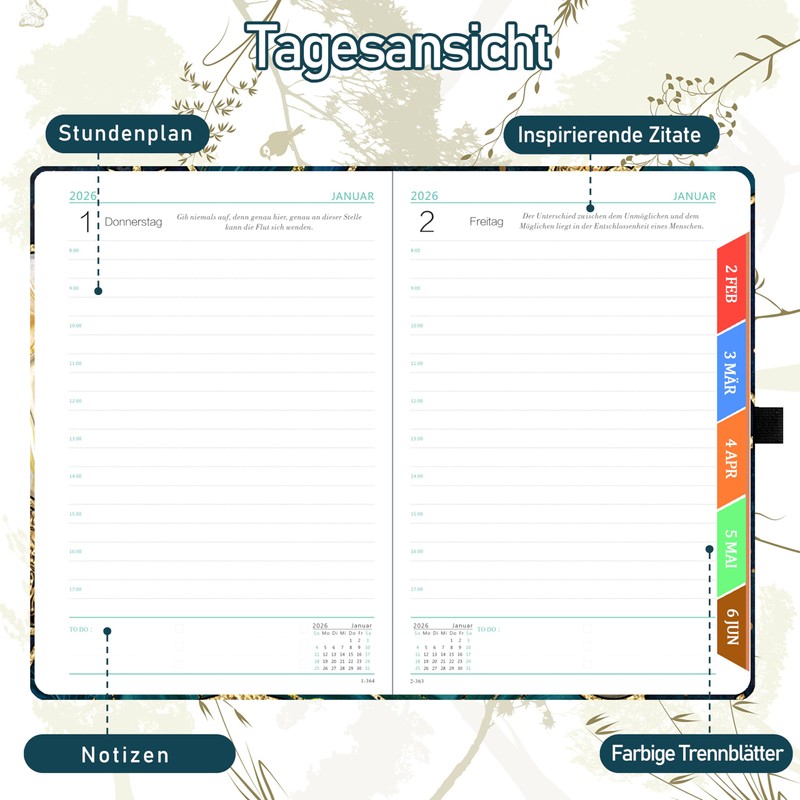 • COMPREHENSIVE 2026 DIARY - DAY PER PAGE - This diary offers a daily overview from January 1st to December 31st, 2026 - completely in German. With 380 pages of high-quality 100gsm paper, you can enjoy a pleasant writing experience without bleeding through - ideal for notes, appointments and tasks.
