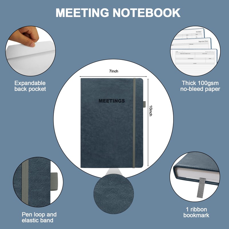 - MEETING NOTEBOOK - Its hardcover is made of high quality leatherette material, elegant, and to last. And it also features a loop for a pen, a ribbon book for easy navigation, an elastic band for easy closure, and a useful back pocket for extra storage.
