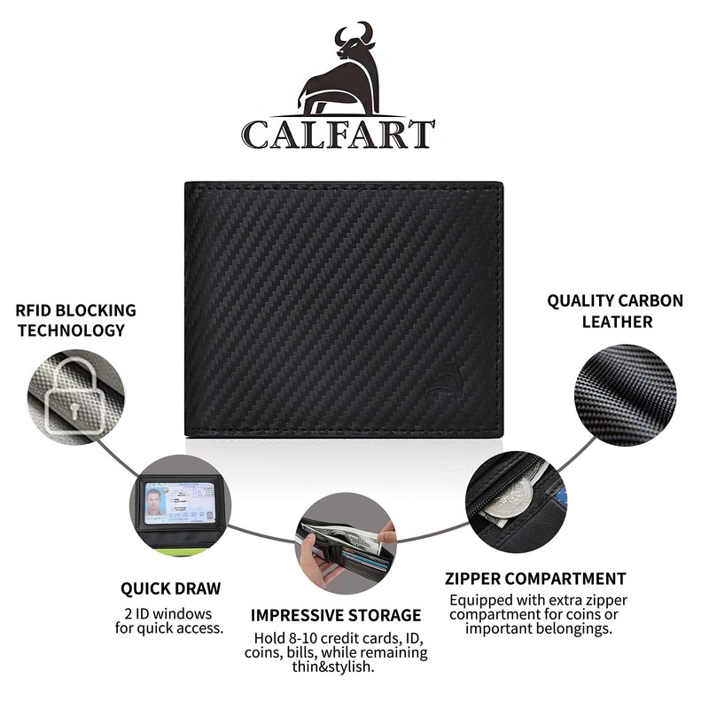 This CALFART mens bifold wallet is equipped with 6 card slots, 2 vertical card pockets, 1 zipper coin pocket, 2 flap ID windows, 2 bill compartments and perfectly sized to carry high capacity stuffs and easy access to front and back pockets.