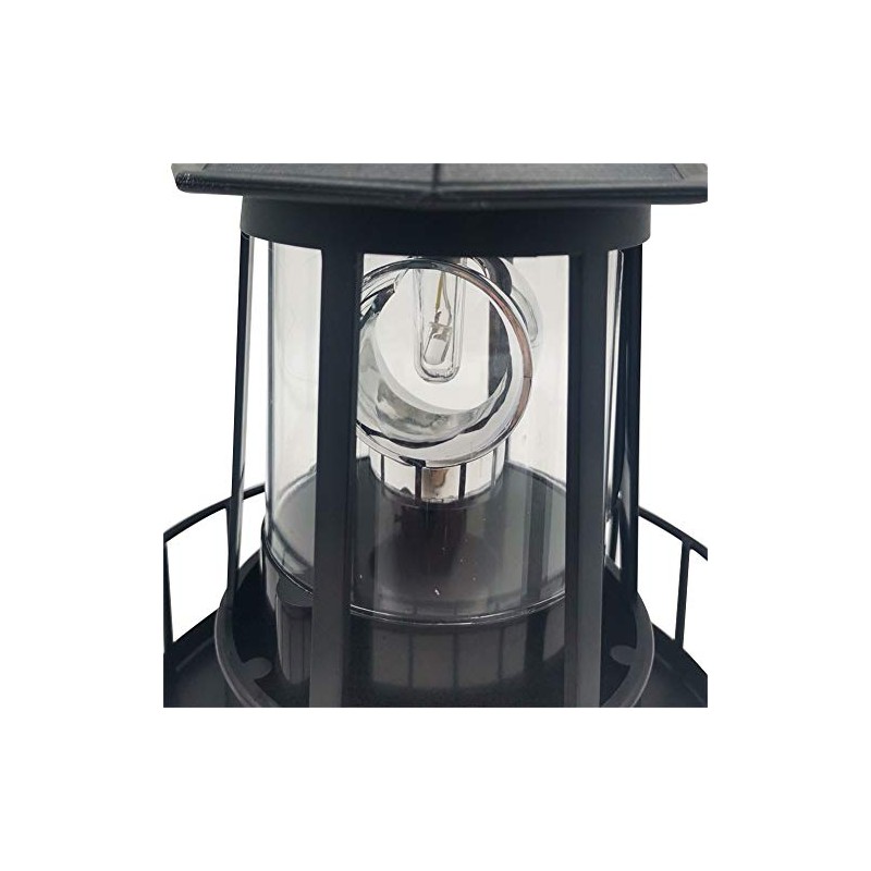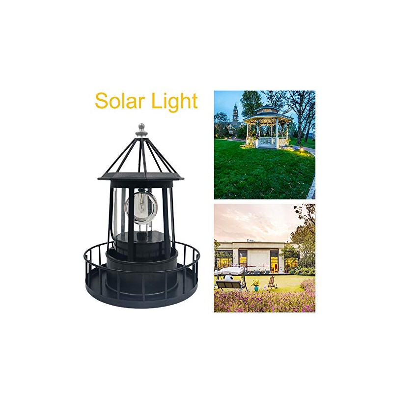 Features: 360 Degree Rotating: LED solar lighthouse will automatically illuminate at night and it will auto 360° rotation, and turn on the lighting mode in real- time, even if it does not light, it has a good decorative effect. Easy Install: It is simple and convenient, durable, Energy saving and environmental protection, do not worry about pollution Occasion: This light is suitable for use in courtyards, lawns, balconies, etc., without wiring or another power supply, no installation, directly on the lawn, or hanging on the tree. Solar Powered: 2 solar panels at the top for fast charging. IP65 Waterproof: With waterproof level 65, it is waterproof and durable. Specifications: Material: wrought iron, ABS Color: black Size(W x H):about 15x21cm/5.91x8.27inches Rated power: 0.03W Voltage: 1.2V Light source type: LED Sunlight time: 8h Protection level: IP65 Solar panel: polysilicon 2V 80MA Battery capacity: built-in 1.2V 400Mah battery Package included: 1pc x solar light Note: 1\. Please fully charge the device under sunlight before first use. 2\. If there is no enough sunlight in 3 months, the battery may run completely flat, and will decrease battery life, so please charge in time. Once it's fully charged, unlock the device and lighting system. Otherwise, it won't work anymore. 3\. If there is no enough sunlight, especial in North countries. it may take longer time to fully charge the device.This is very normal for solar products. 4\. Due to the light and screen difference, the item's color may be slightly different from the pictures. 5\. Please allow 0.5-2 cm differences due to manual measurement.