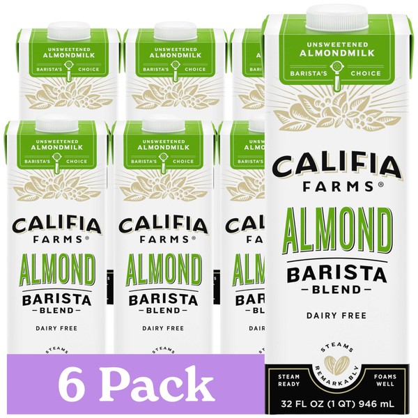 Califia Farms - Unsweetened Almond Barista Blend Almond Milk, 32 Oz (Pack Of 6), Shelf Stable, Dairy Free, Plant Based, Vegan, Gluten Free, Non GMO, Sugar Free, Milk Frother, Creamer