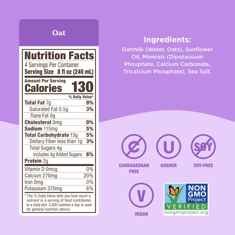 Our new Oat Barista Blend steams beautifully, perfectly pairs with coffee, and tastes great by itself. It’s also unsweetened, made with whole rolled, gluten free oats and has no gums or stabilizers