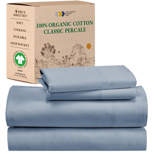 California Design Den 100% Organic Cotton King Size Sheet Set, Percale Sheets, Deep Pocket King Sheets, GOTS Certified Luxury Sheets, King Size Cotton Bed Sheets, Blue Hydrangea Sheets