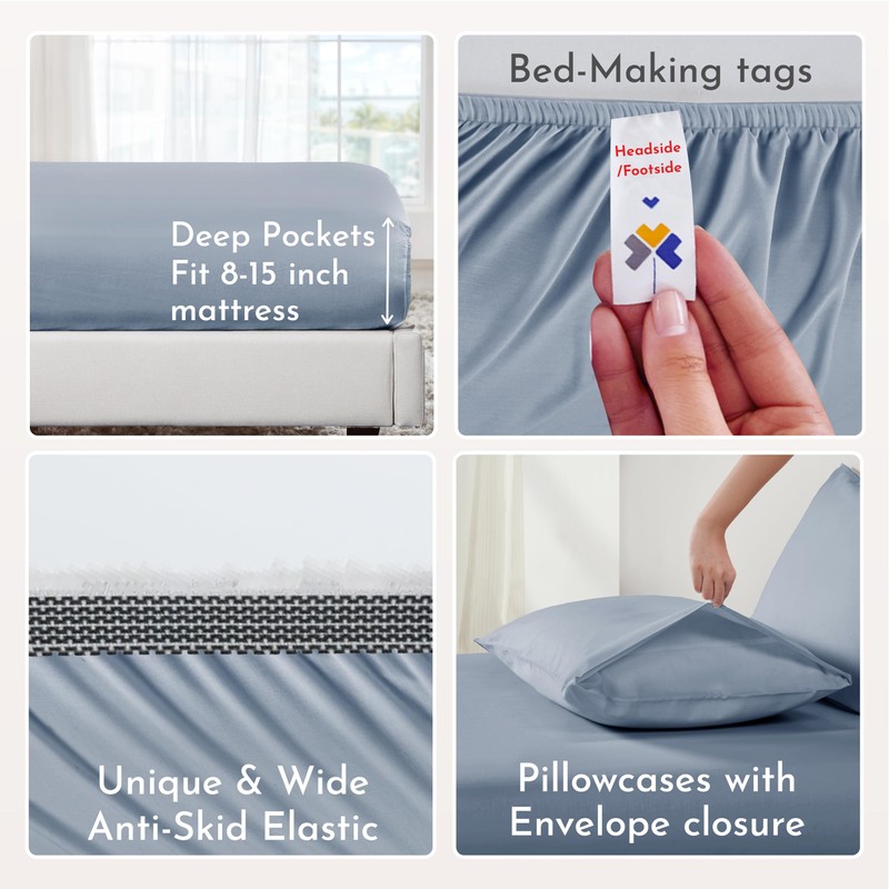 - WELL-FITTING COMPLETE SET: Our soft 4-piece organic cotton king size sheet set includes 1 top sheet, 1 bottom fitted sheet that fits mattresses 8 to 15 inches deep, and 2 king size pillowcases with envelope closure. The special anti-skid wide elastic won't loosen or bunch up, and head/foot side indicators make bed-making a breeze.