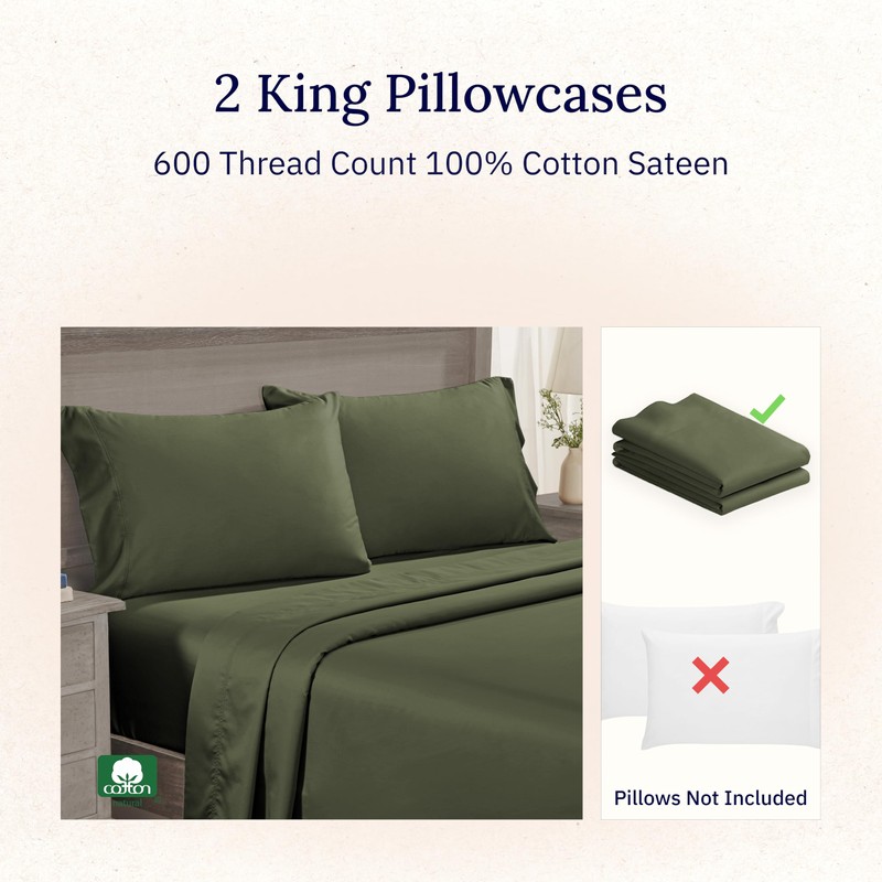 California Design Den King Size Pillowcase Set of 2 - Luxuriously Soft Hotel Quality 600 Thread Count, 100% Cotton Pillow Case Covers, Crisp & Cool Sateen, Fits King Pillows - Olive Green