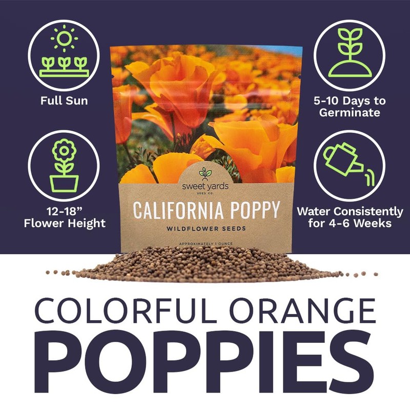 **California Poppy - Orange – California Natives Wherever You Want!** Breathtaking fields of orange wildflower are often seen on the west coast, particularly California, where it’s claimed as the state flower. However, these carpets of orange blossoms can be recreated anywhere in the country. This annual wildflower adapts well to any soil type, blooms spring through fall and is deer resistant. **Who says quality and quantity don’t mix!?** We want to give you the biggest bloom for your gardening buck, that’s why we put over 1 full ounce of seeds in our packets. That's more than 10 times the amount you'll get in a store-bought packet! That’s also why we only sell the freshest seeds available. Each packet is filled with our continuously rotating stock of wildflower seed, ensuring that the packet you purchase holds fresh seeds ready to plant for the current growing season. **GUARANTEED TO GROW** We're so confident that you'll have success with our seeds that we guarantee they will germinate, or we'll give you a full refund within 30 days of purchase.