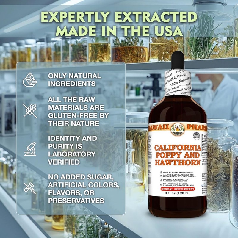 - Made in the USA with Superior Quality: Proudly crafted in the USA (Hawaii), our California Poppy And Hawthorn Extract uses select, high-quality ingredients sourced from trusted suppliers. Each batch undergoes rigorous laboratory testing to ensure it meets the highest standards of safety and potency. By choosing Hawaii Pharm, you are supporting American-made products and a brand dedicated to delivering the best in herbal extracts.