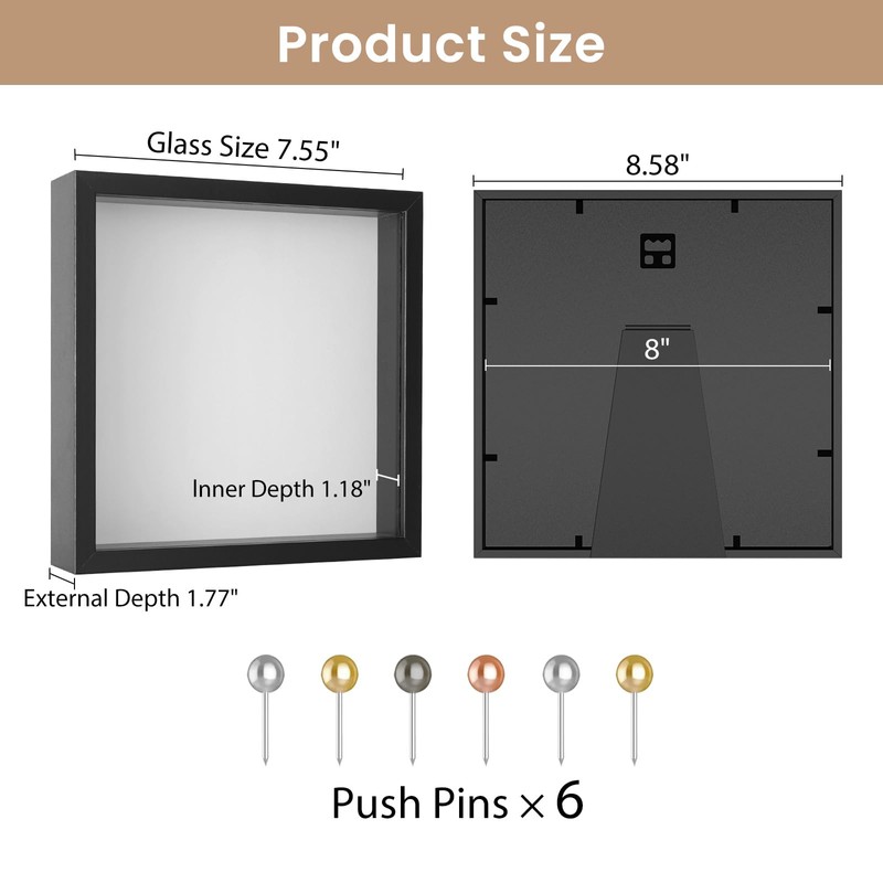 - Size and Packaging: This shadowbox has an overall size of 8.58"x8.58"x1.77", with an internal size of 7.55"x7.55"x1.18". Each is packed well to ensure it arrives in flawless condition