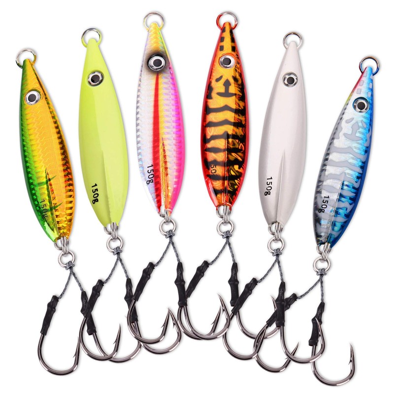Calissa Offshore Tackle Fast Fall Jig 80g 150g 250g 300LBS Assist Hooks 3/0 Butterfly - Vertical Jig Speed Lure Slow Pitch Fall Glow Options (6 Pack, 150g)