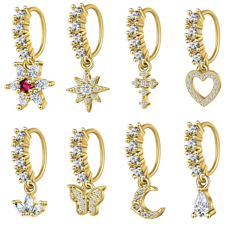 - DIFFERENT STYLES A set consists of 6 pieces nose piercing rings in different designs, including elegant hanging elements such as flowers, stars and butterflies. These nose piercings are suitable for both men and women and offer a unique, fashionable look that accentuates your personality