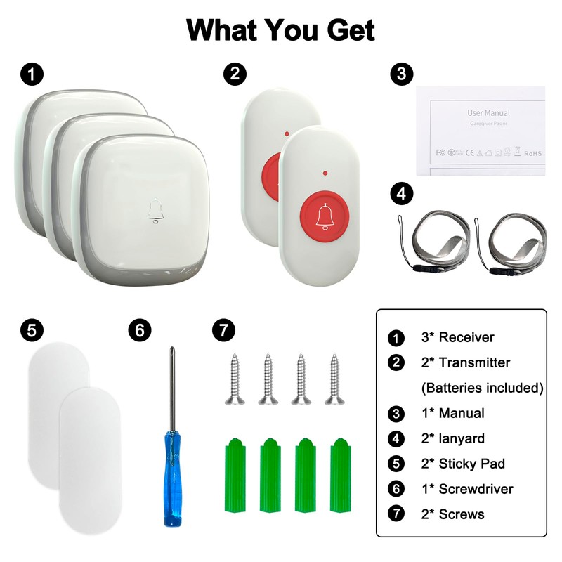 Call Button for Elderly at Home, Caregiver Pager | Fall Alert Devices for Elderly 500+ft for Home/Elderly/Pregnant Women/Disabled, 3 Receivers+2 Transmitters