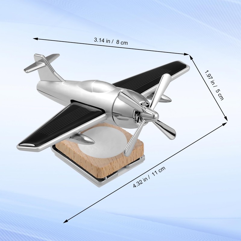 CALLARON Airplane Car Diffuser, Solar Rotatable Aircraft Decoration, Airplane Car Freshener with Wood Base, Unscented Rotating Alloy Ornament, Silver, 3.93inch for Car, Office, Home