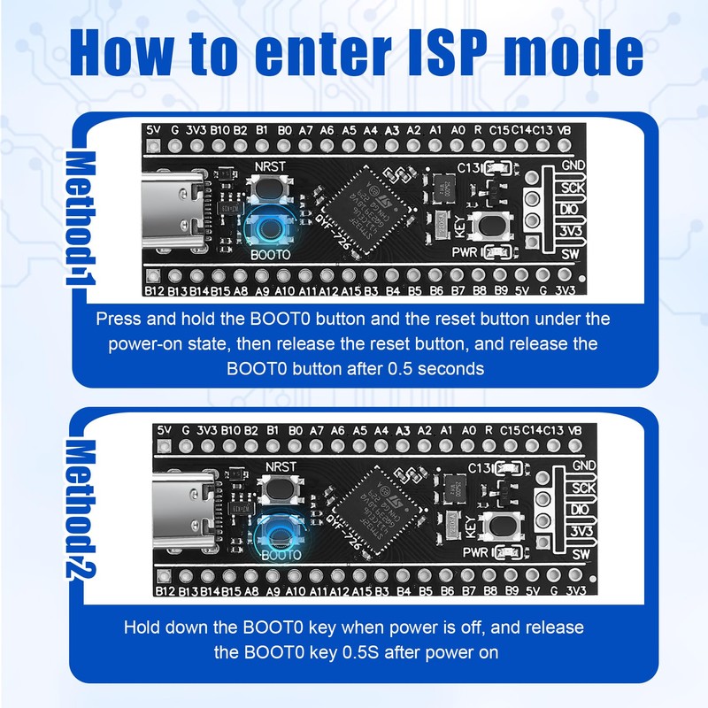 Method 1:Press and hold the BOOT0 button and reset button when it is on, then release the reset button and release the BOOT0 button after 0.5 seconds.