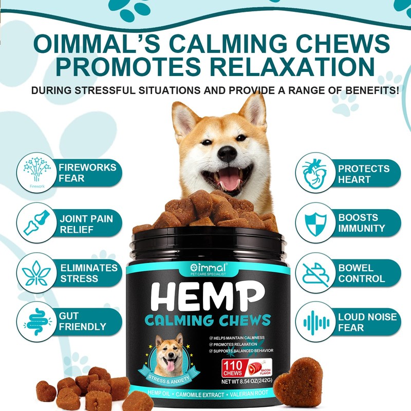 - Relieves Stress & Separation Anxiety - Calming chews for dogs helps soothe and reduce hyperactivity, excessive barking and chewing, anxious dog caused by fireworks, loud noises, or thunder, and other behavioral issues. Maintains a normal and relaxed mood for dogs.