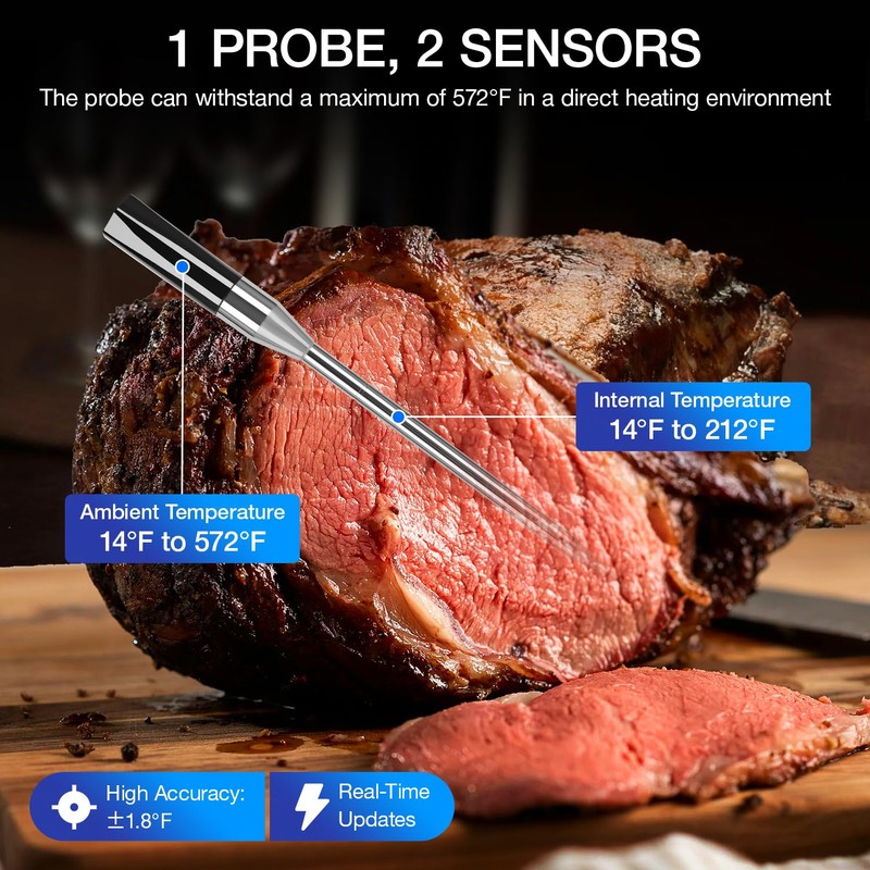- 🔥 High-Precision Probe: Equipped with dual sensors, this Bluetooth meat thermometer monitors both internal temperatures (up to 212°F) and external/ambient temperatures (up to 527°F) simultaneously. Its ultra-sensitive probe delivers real-time readings within one second, boasting precision accuracy of ±1.8℉.