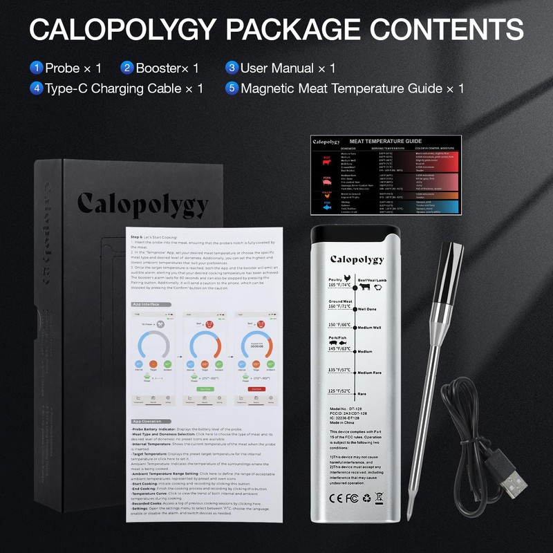 Calopolygy Wireless Meat Thermometer, Bluetooth Meat Thermometer with IPX7 Waterproof Probe, Extended Range, iOS & Android App, Preprogrammed Temperatures for BBQ, Grill, Smoker, Oven & Air Fryer
