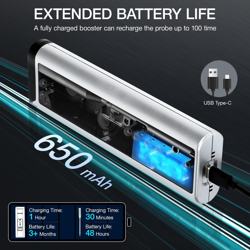 - 🔥 Extended Battery Life: Enjoy up to 48 hours of continuous use on a full 30-minute charge. With a powerful 650mAh battery, the base station can fully recharge the probe up to 100 times, providing a hassle-free experience with less downtime.
