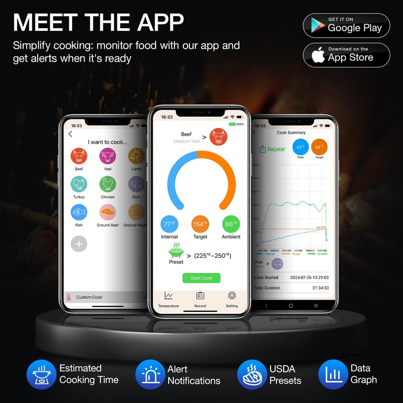 - 🔥 Advanced App & Alerts: Stay connected with instant notifications via the Smart Meat Thermometer App. Customize timers, track temperature trends, and use USDA-recommended preset temperatures to achieve perfect results with every BBQ, grill, or oven use.