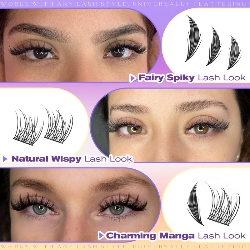 - Beginners-Friendly! Dare to Play!: Wispy eyelash clusters kit with waterproof bond and seal lash glue and lash applicator for effortless lashes beauty! Durable cluster lashes kit DIY natural or fairy eyelash extensions with easy application, even for beginners. Build any style—from subtle wispy to bold manga glam. Dare to play
