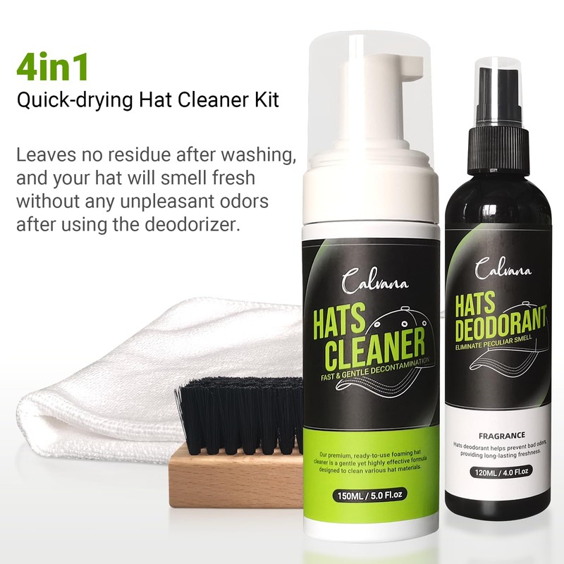 Calvana 4-in-1 Professional Hat Cleaning Kit, Quick-drying Cap Saver Cleaner, for Baseball Caps,Cowboy Hat, Felt Hat, Safe for Cotton, Wool, Polyester, 5oz Solution, Includes Towel and Brush