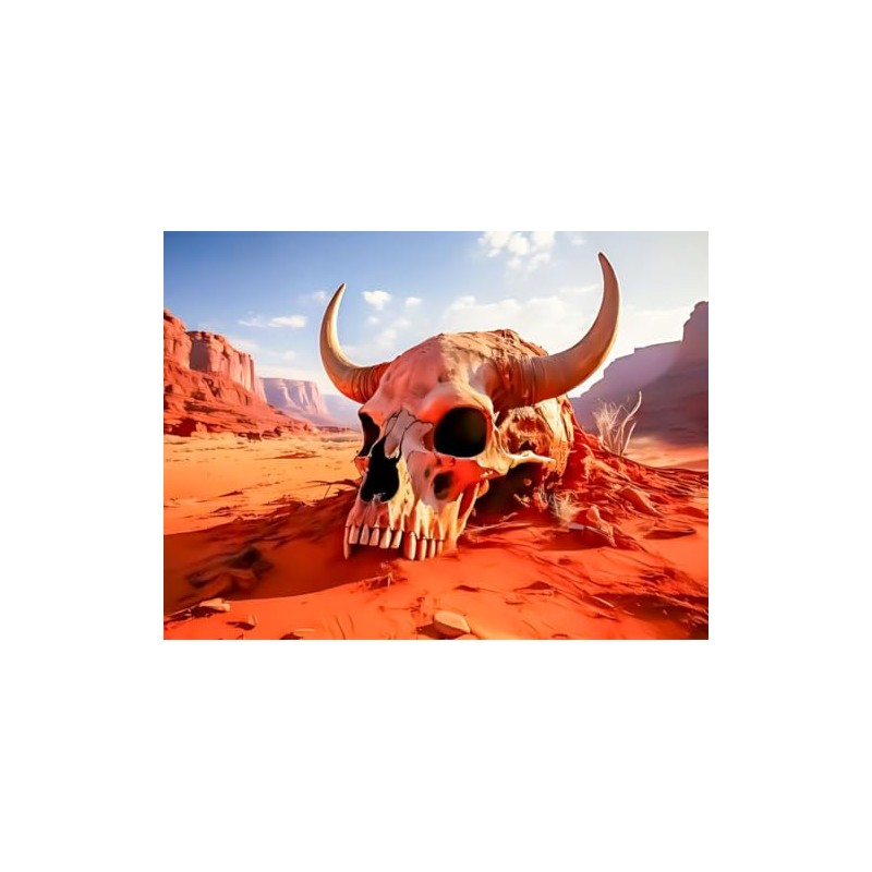 On a jagged rocky plateau, surrounded by glowing red sand dunes, lies a weathered giant skull, half submerged in the sand. The bones are cracked and dried out, whipped by the hot wind as dust storms sweep across the horizon. The skull still has the rusty remains of an ancient helmet clinging to it - a last reminder of a lost warrior culture.