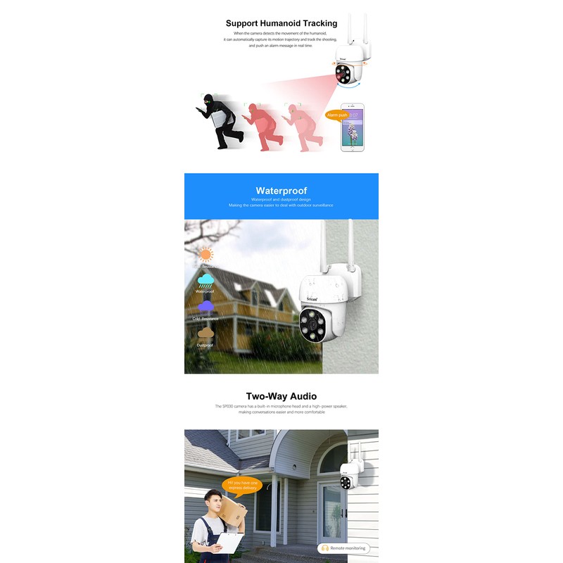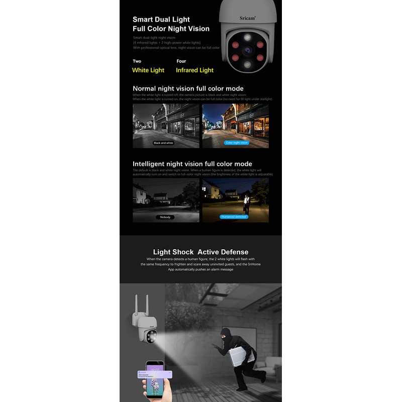 - 【Detección y alerta】Con una función construida de alerta tecnológica de detección de actividad de alta sensibilidad, encender las notificaciones push para estar al tanto de las cosas, cuando se detectan objetos en movimiento, la lente hará un seguimiento y la alarma se enviará a los dispositivos en menos de 3 segundos. Simplemente abra la aplicación SriHome para comprobar rápidamente lo que está pasando.Se puede añadir tantas cámaras como deseen en su APP para monitorizar varios lugares.