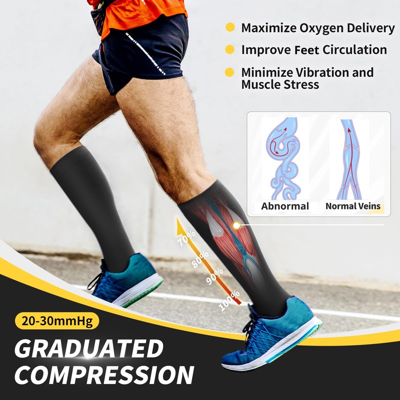 - Graduated Compression - With 20-30mmHg compression, Cambivo compression socks will boost your blood circulation, and enhance the oxygen flow to your muscles; Help reduce the accumulation of lactic acid, minimize leg fatigue, soreness, swelling, muscle cramps and other leg issues and improve your workout performance; Great solution to beat tiredness and energize your day