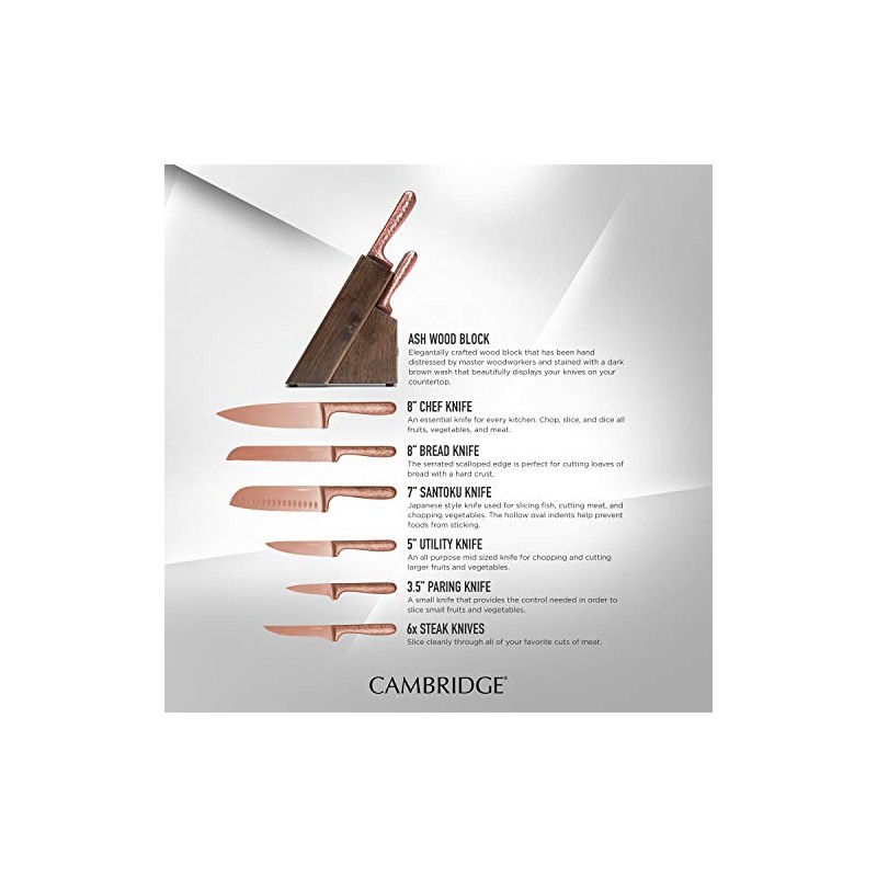 - Includes: 6 Steak Knives; 1-8" Chef Knife; 1-8" Bread Knife; 1-7" Santoku Knife; 1-5" Utility Knife; 1-3.5" Paring Knife; and 1 ash wood storage block