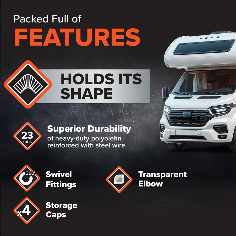 - Built Flexible & Tough: Constructed with 23 mils of durable polyolefin and reinforced with steel wire, the RhinoFLEX RV black water hose can bend & maintain its shape for reliable, long-lasting use.