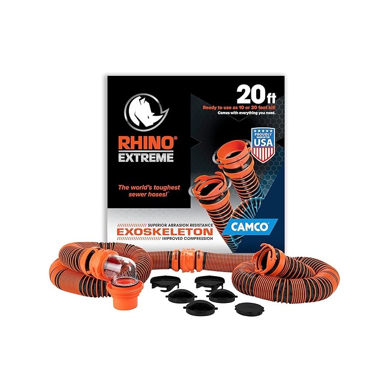Camco RhinoEXTREME 20' RV Sewer Hose Kit – Premium Sewer Kit — Pre-Assembled & Ready-to-Use — Includes 4-in-1 Dump Station Adapter & Storage Caps — Crush & Abrasion Resistant (21012)