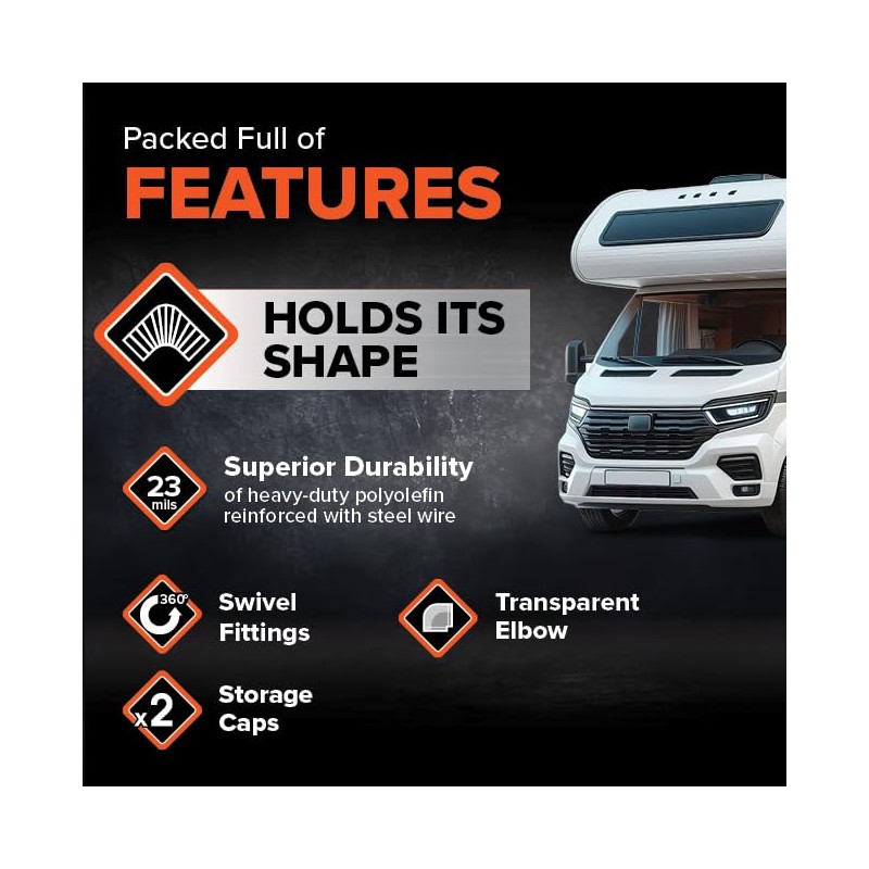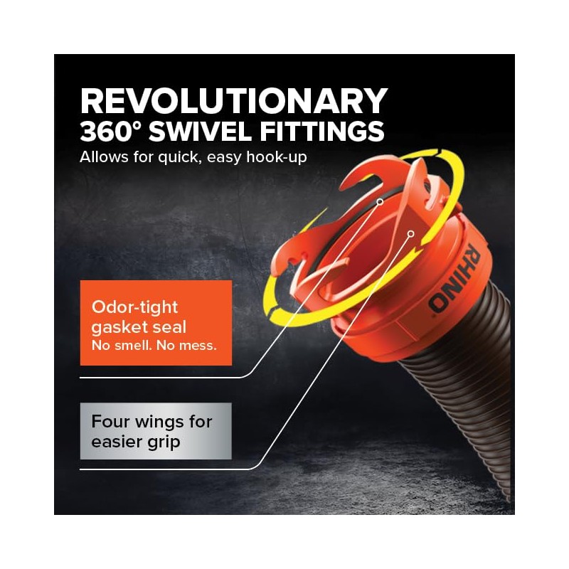 - Rugged, Flexible Build: Constructed with 23 mils of durable polyolefin and reinforced with steel wire, the RhinoFLEX RV waste hose can bend and maintain its shape for reliable, long-lasting use.