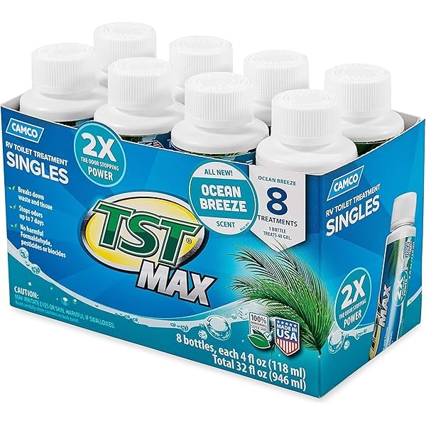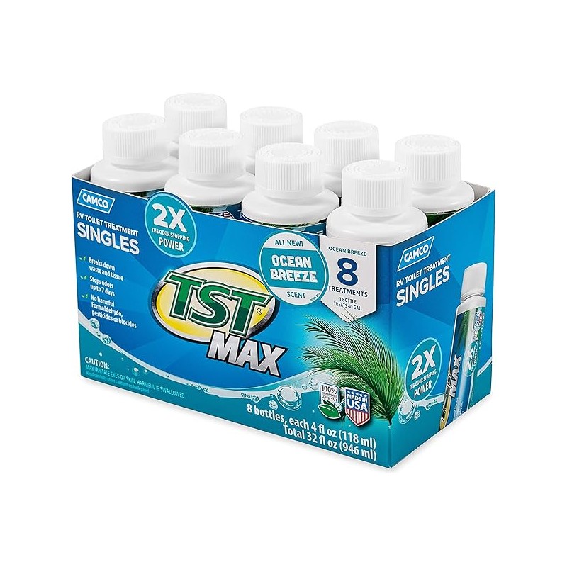 Camco TST MAX RV Toilet Treatment - Formaldehyde Free - Breaks Down Waste And Tissue - Septic Tank Safe - Treats up to 8-40 Gallon Holding Tanks -Ocean Breeze Scent, (8) 4 oz Bottles (41610)