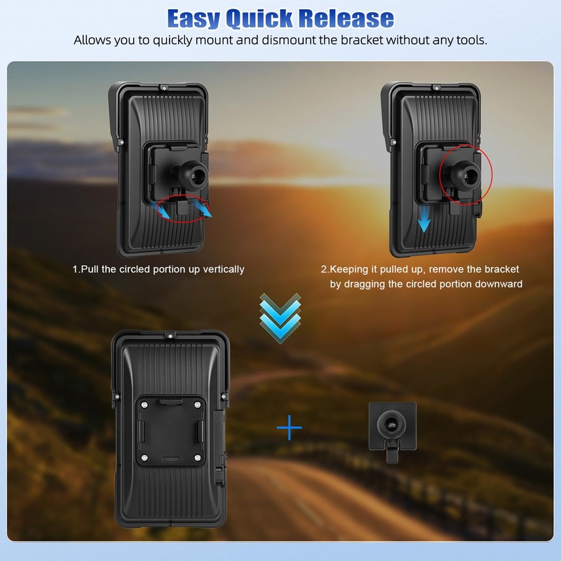 - [Easy to install/detach & wide compatibility]. Extremely easy to install and release, can be installed in many parts of the motorcycle with 5 minutes, the screen can be removed in three seconds to prevent loss. Suitable for all motorcycles, 12 V voltage, operating temperature: -4 ~ 149 ℉