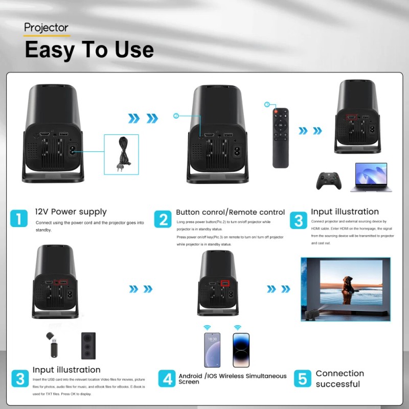 1. Portable and lightweight: The mini projector is lightweight and compace in size. It is a portable product for home and travel.