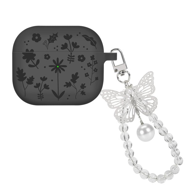 CameCosy for AirPods 3rd Generation Case with Silver Butterfly Keychain, Pretty Engraved Flower Design Soft Dust Cap Shockproof Protective Cover Case for Airpods 3 Gen-Black