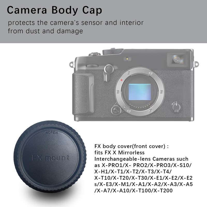 - 2. The Body Cap fits FX X Mirrorless Interchangeable-lens Cameras such as X-PRO1/X- PRO2/X-PRO3/X-S10/ X-H1/X-T1/X-T2/X-T3/X-T4/ X-T10/X-T20/X-T30/X-E1/X-E2/X-E2s/X-E3/X-M1/X-A1/X-A2/X-A3/X-A5/X-A7/X-A10/X-T100/X-T200 and so on