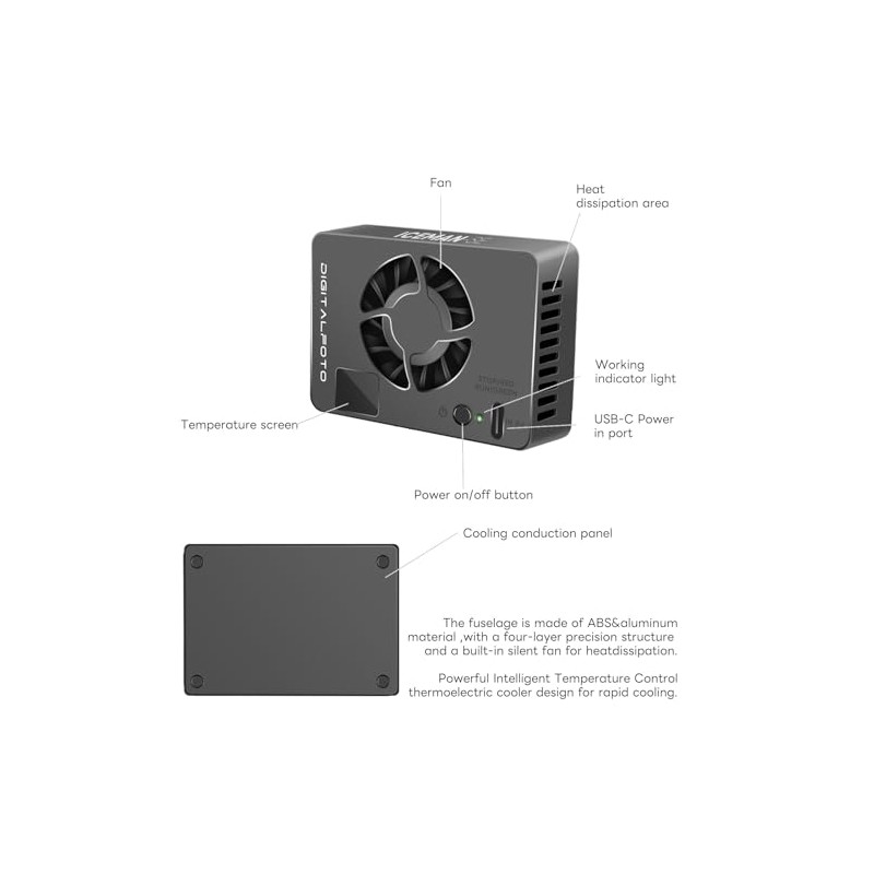 • 【Thermoelectric Aluminum Alloy】Camera fan application of thermoelectric cooling technology can truly cool down mirrorless cameras, ensuring longer recording times and limits overheating