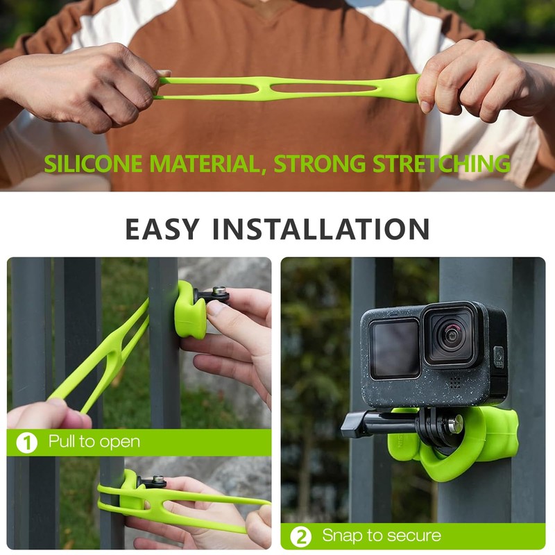 - Durable and Strong: Camera Mount Strap is made of silicone, flexible and durable, fashionable color and design. It is very easy to clean. Compact and easy to carry, you can put it in your pocket and take it anywhere