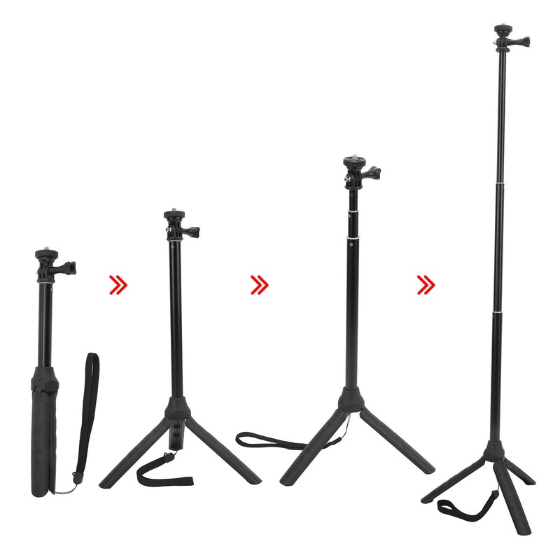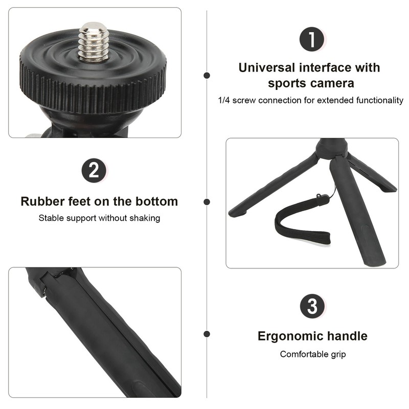 1、ADJUSTABLE: Retractable selfie stick tripod with three sections, freely adjustable, quick and easy to rotate and lock. 2、UNIVERSAL INTERFACE: Camera phone tripod with universal interface for sports cameras and 1/4 screw connection for extended functionality. 3、ANTI SLIP: Mini desktop phone tripod has rubber feet on the bottom for stable support when unfolded. 4、UNIQUE DESIGN: Camera tripod with ergonomic grip for a more comfortable grip and a cut out design on the inside to reduce the burden of shooting. 5、WITH HAND STRAP: Mini camera phone tripod comes with a hand strap, which makes it easy to carry around.