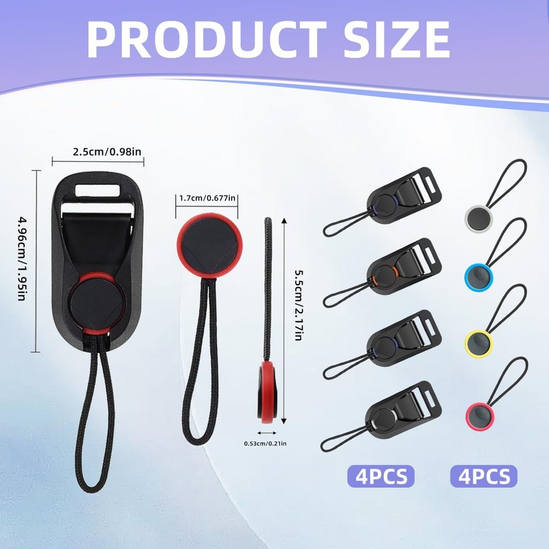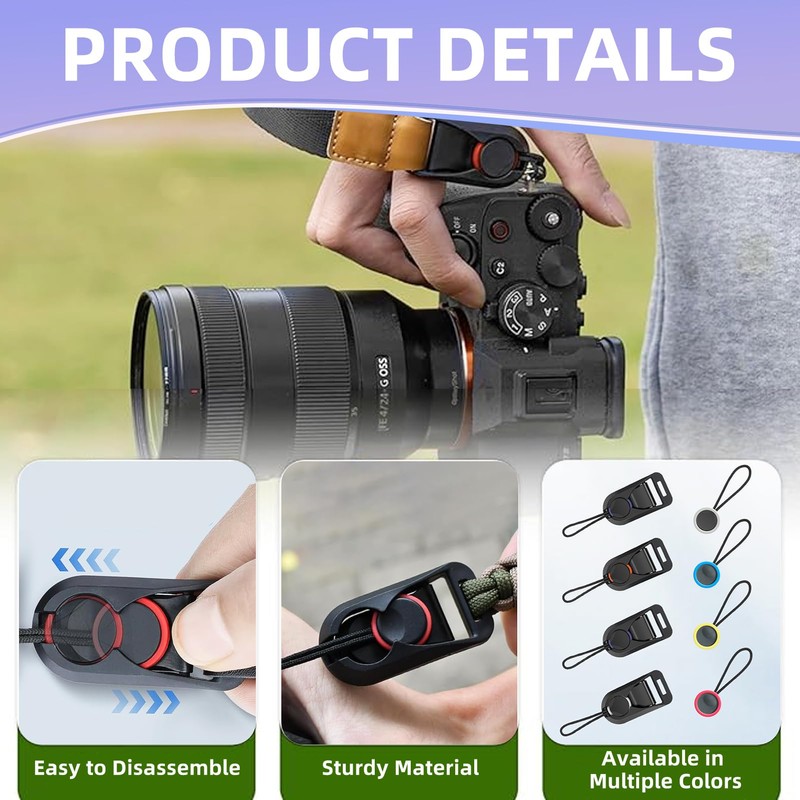 • Practical 8-piece complete set - Package includes: 4 camera strap quick release fasteners, 4 pre-assembled anchor loops and 4 additional replacement loops. The colours grey, red, orange and blue help distinguish multiple cameras or belt systems.