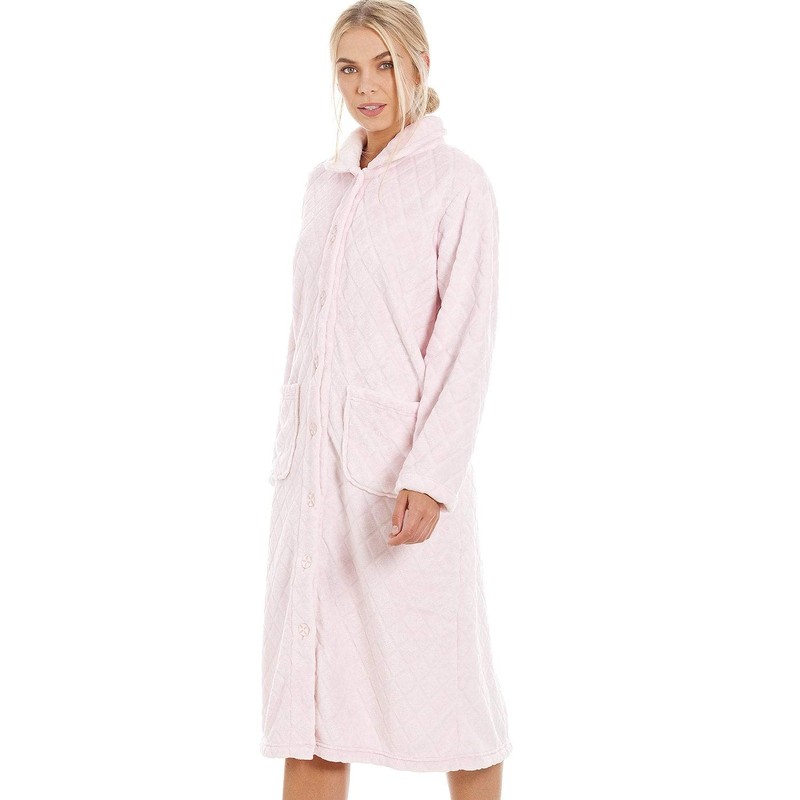Camille Women's Super Soft Fleece Housecoat -Diamond Print Button Up Bathrobe - Long Sleeved and Side Pockets for Ultimate Comfort & Warmth Pink 14-16