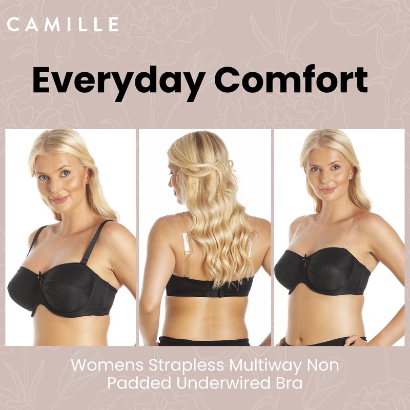 Camille Womens Multiway Strapless Bra - Non Padded & Underwired with Removable Matching & Clear Straps - Cross Back, Strapless, Halter or One Strap Black 42C