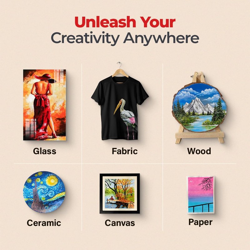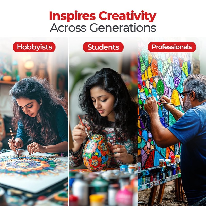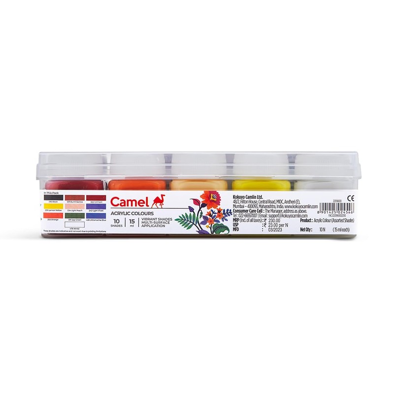 This item Camlin Kokuyo Fabrica Acrylic Ultra Color, 15ml, 10 Shades Camel Fabric Acrylic colours are specially developed for hobby painting. It is best on fabrics, canvas, wood and earthenware. It can be used on more surfaces. They are easy and ready to use. They do not require any medium. All you do is just dip the brush and start painting. They are available in 66 Shades in 3 varieties - ultra, pearl and metallic . Available in 10ml,15ml, 100ml and 500ml