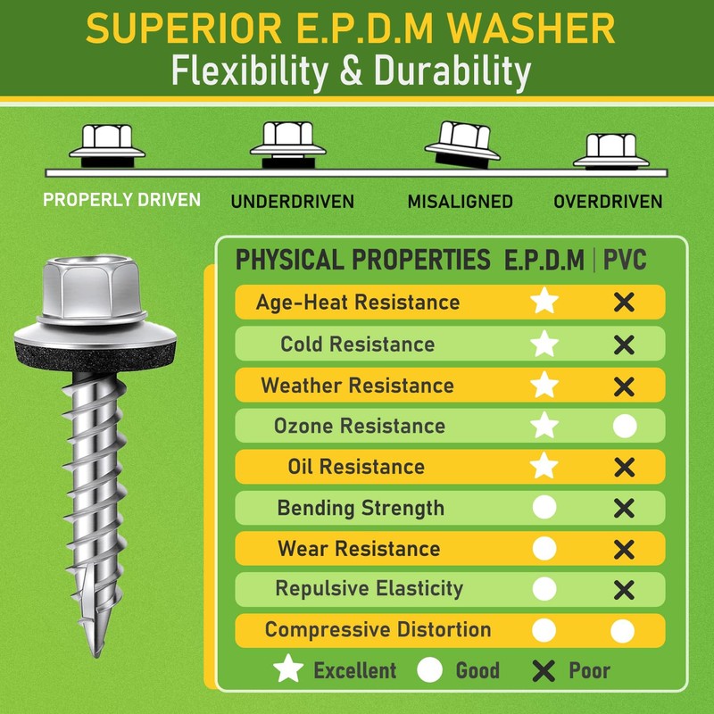 - 【 EPDM Washer 】 - These hex roofing screws with EPDM washers which have well performance in sealing, it against water leakage and dust, and the rubber gasket also helps to evenly distribute the load pressure for a stable, long-lasting fixing.