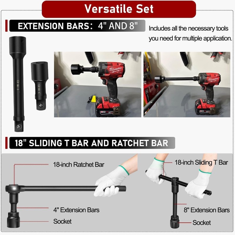 • FUNCTION -- This Impact Socket Set with adapters and ratchet handle is perfect for removing and installing wheel lug nuts, particularly suitable for most trucks, RVs, and other heavy-duty vehicles. Precisely machined impact socket set provides extreme levels of torque changes.