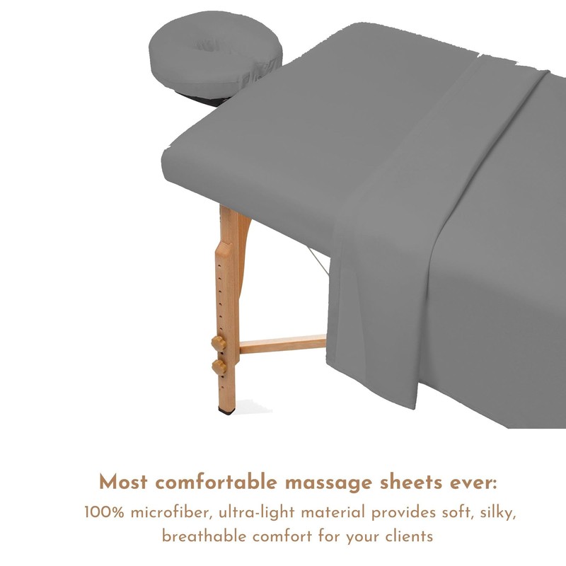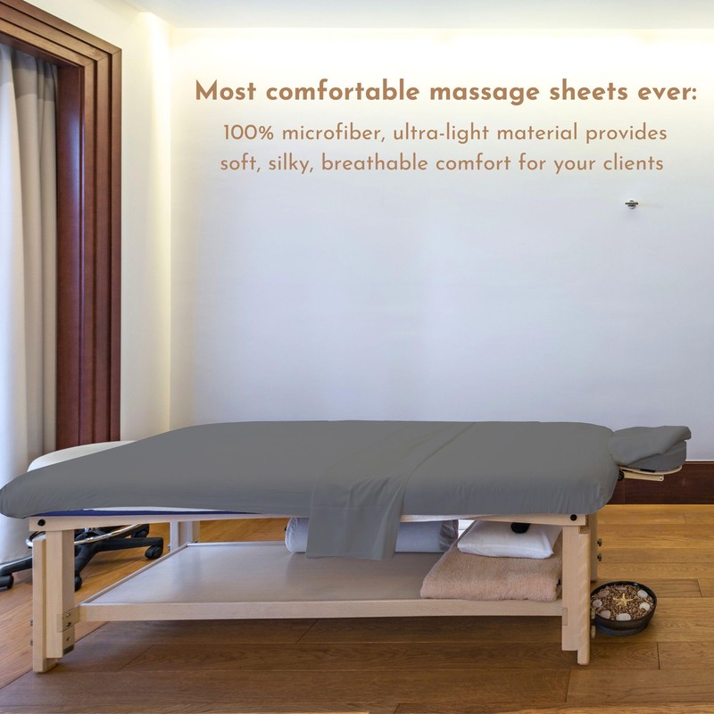 Indulge your clients in the ultimate comfort with our Massage Table Sheets 3-Piece Set. Crafted from premium microfiber, these ultralight and breathable sheets provide a luxurious experience during massages and treatments. The set includes a fitted sheet, a flat sheet, and a face rest cover, ensuring a perfect fit for standard massage tables. The soft and durable microfiber material is easy to clean, making it ideal for frequent use in spa and wellness settings. Elevate your massage therapy sessions with this high-quality and practical sheet set that combines functionality and comfort seamlessly. Treat your clients to the relaxation they deserve with our Microfiber Massage Table Sheets.